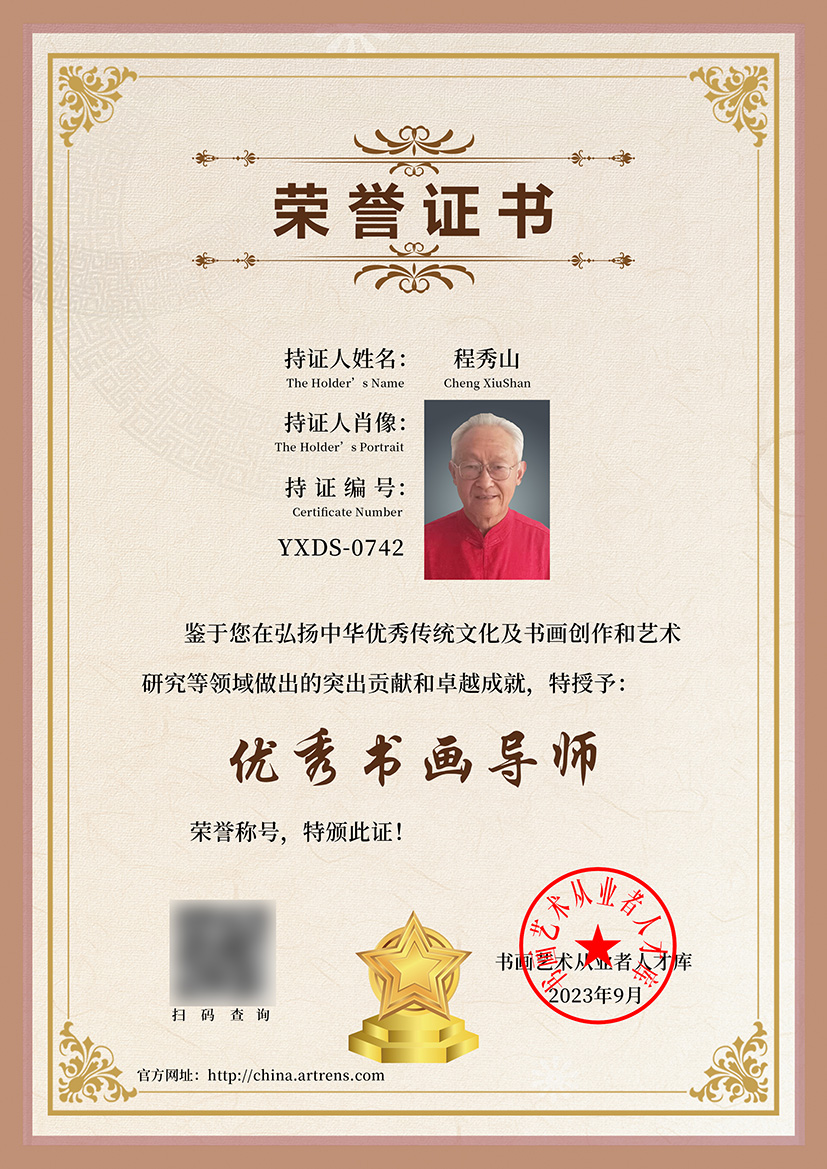 程秀山先生获评为全国书画艺术从业者人才库优秀书画导师