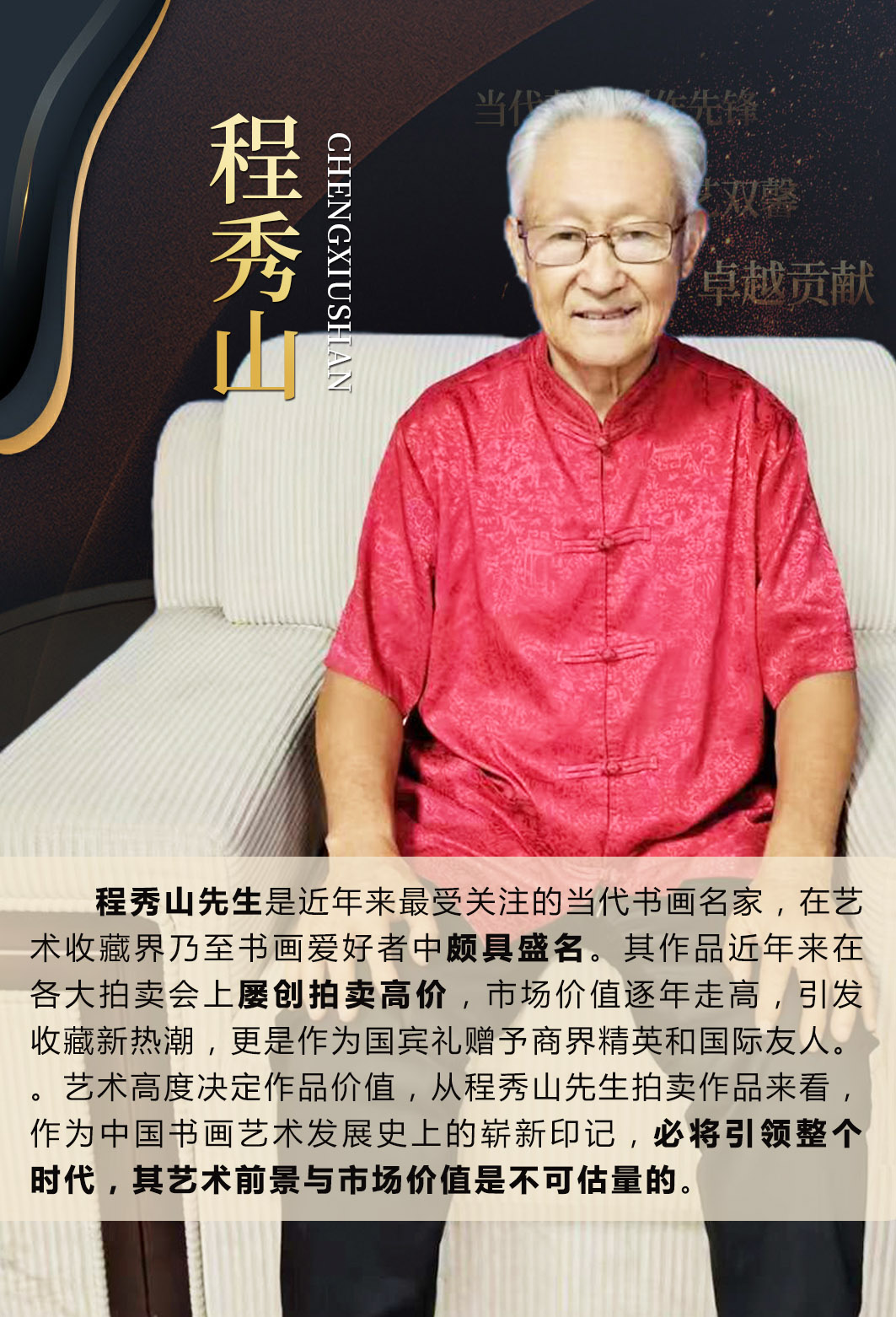 程秀山先生是优秀书画导师,国务外交礼品师。程秀山先生作品不仅走进了世界三大顶 级艺术殿堂,在国内300余家博物馆中也均有藏展。中国四大 拍 卖 行雅昌、保利、瀚海、嘉德的专家曾说:“书画拍 卖,十五年前看吴冠中,范曾、五年前看傅抱石,李桦,当代看崔如琢,黄永玉,未来看程秀山”。