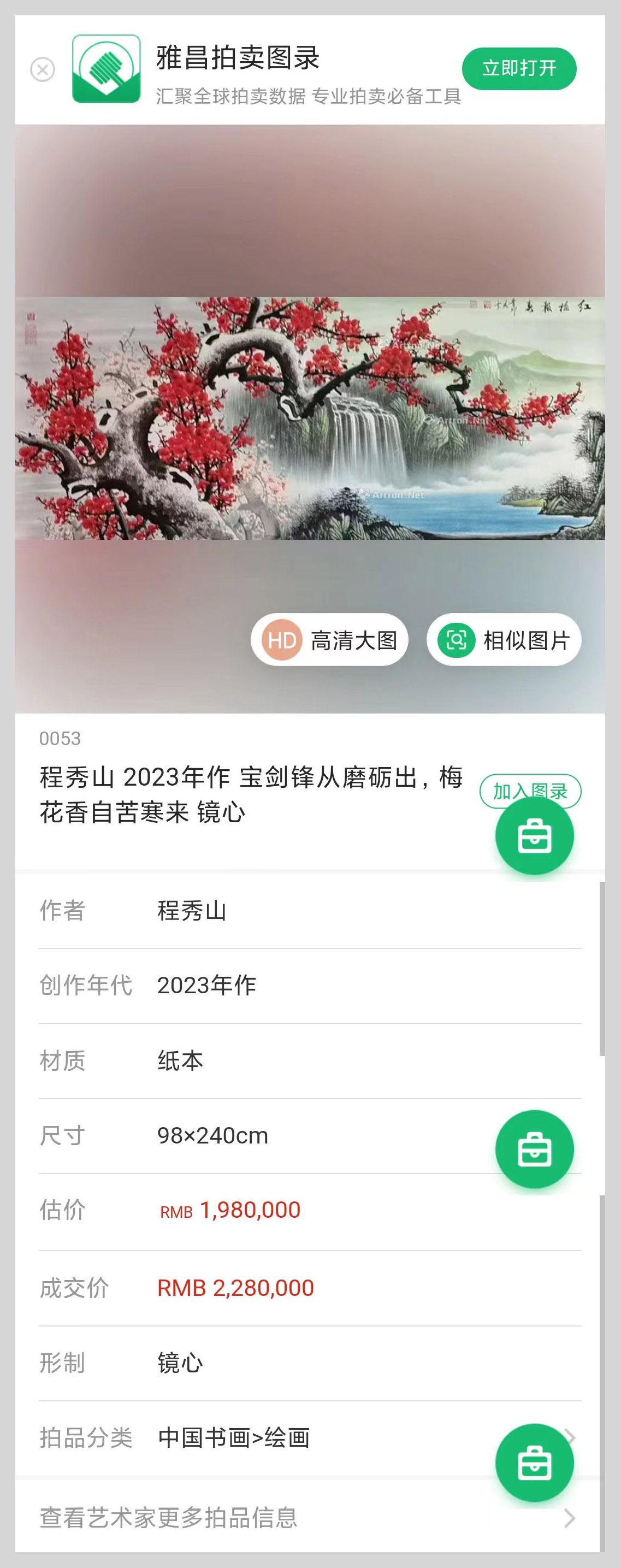 作品《宝剑锋自磨砺出 梅花香自苦寒来》以228万落槌成交。