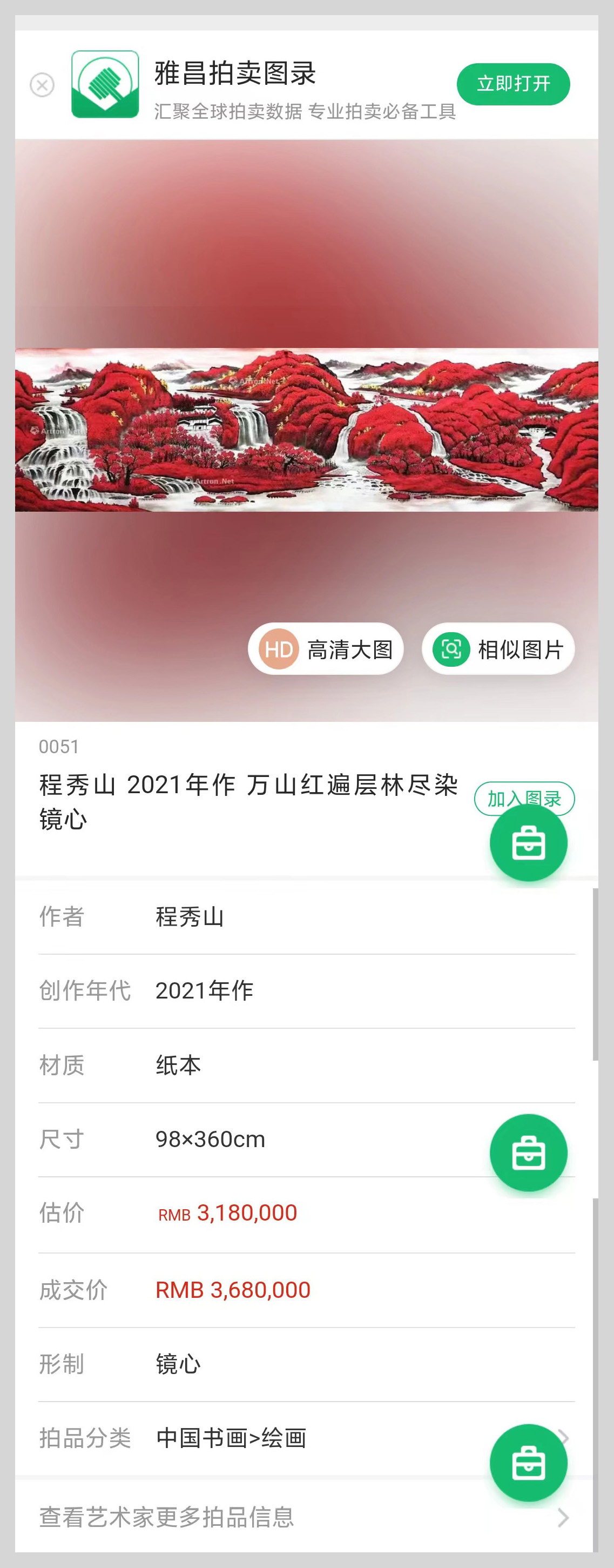 作品《万山红遍 层林尽染》以368万落槌成交。