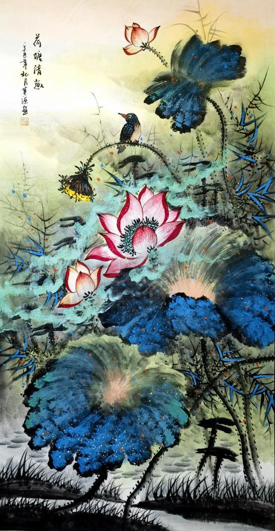 莫源先生作为当代泼彩新典范的开创者,其泼彩艺术造诣对比张大千先生其佳作可堪称“青出于蓝而胜于蓝”即承继传统,又自成一家。画作无论从构图,泼墨、泼彩既继承了古典布局特征,又彰显了时代性又有着较强的自我特点,变化无穷内容丰富。给观者更多的遐想空间。在泼彩的创作上,有自己独特表现技法和绘画理论,他的泼彩始终坚持传统技法和理论,融合西方抽象思维,运用西方光色原理。色彩使用上清新雅逸,强化墨色交融,突出抽象朦胧的画面效果;在笔墨的运用上讲究气韵生动,同时又强调中锋运笔以突出力量感,色彩泼辣艳丽。画面呈现出俊逸洒脱、泼辣浪漫、视觉冲击力更强的意境美。