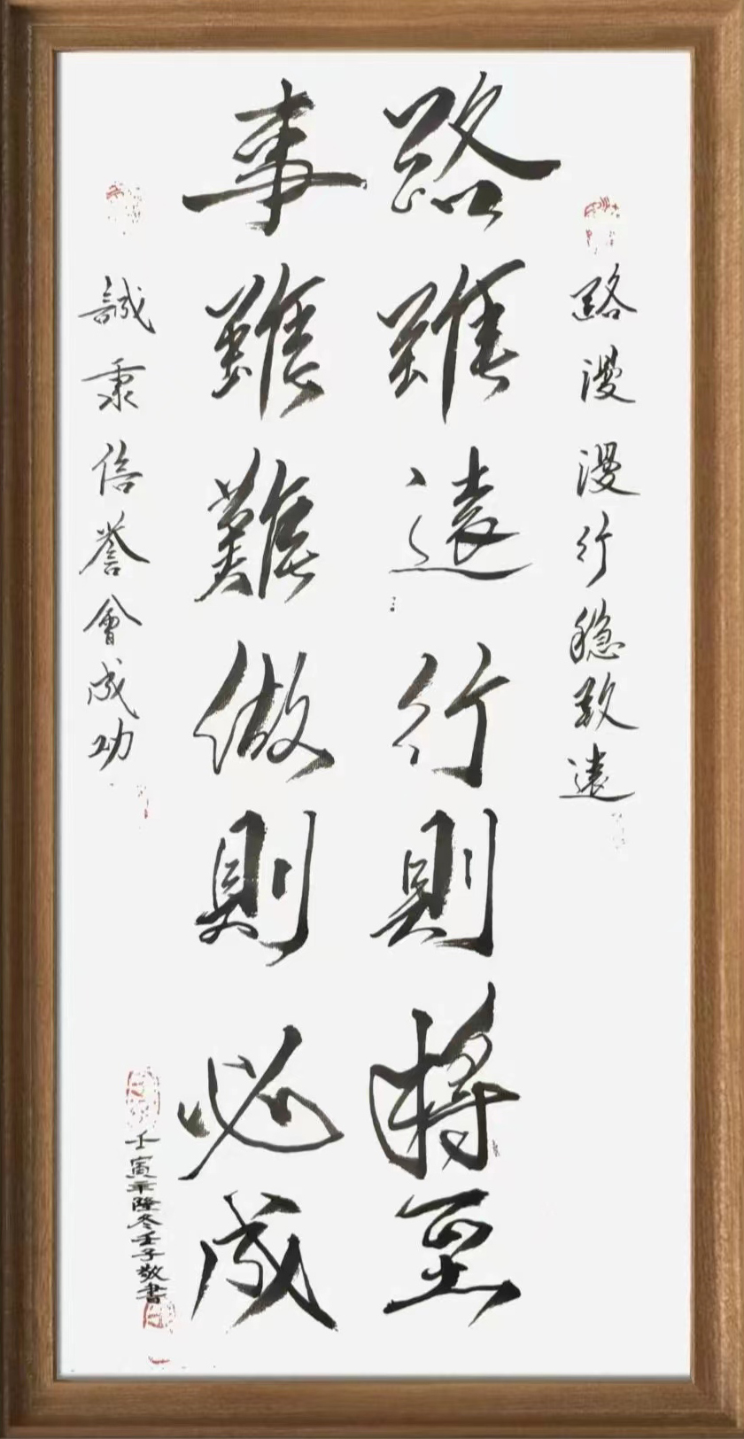 书法之法,贵在笔墨得法。壬子老师笔墨入法门,线条表意随心所欲,非常强调书法唯线条为佳的塑造力,先写鸿飞兽骇,再写鸾飞凤舞,笔墨类万物之象,一点之内殊衄挫于毫茫,一划之间变起伏于锋梢,八面出锋,变化多端!笔未到气已吞,不求为佳反为最佳!令其书法心手双畅,智巧兼优!笔墨映心,矢志不移。他的书法在传承正宗根基上,又有书法创新的大志向,师于碑帖不拘泥,自有创建成一家。不做书奴,不失自我,他自创书体正渐入佳妙,在心笔合一的推动下,艺术之功渐成闻达。