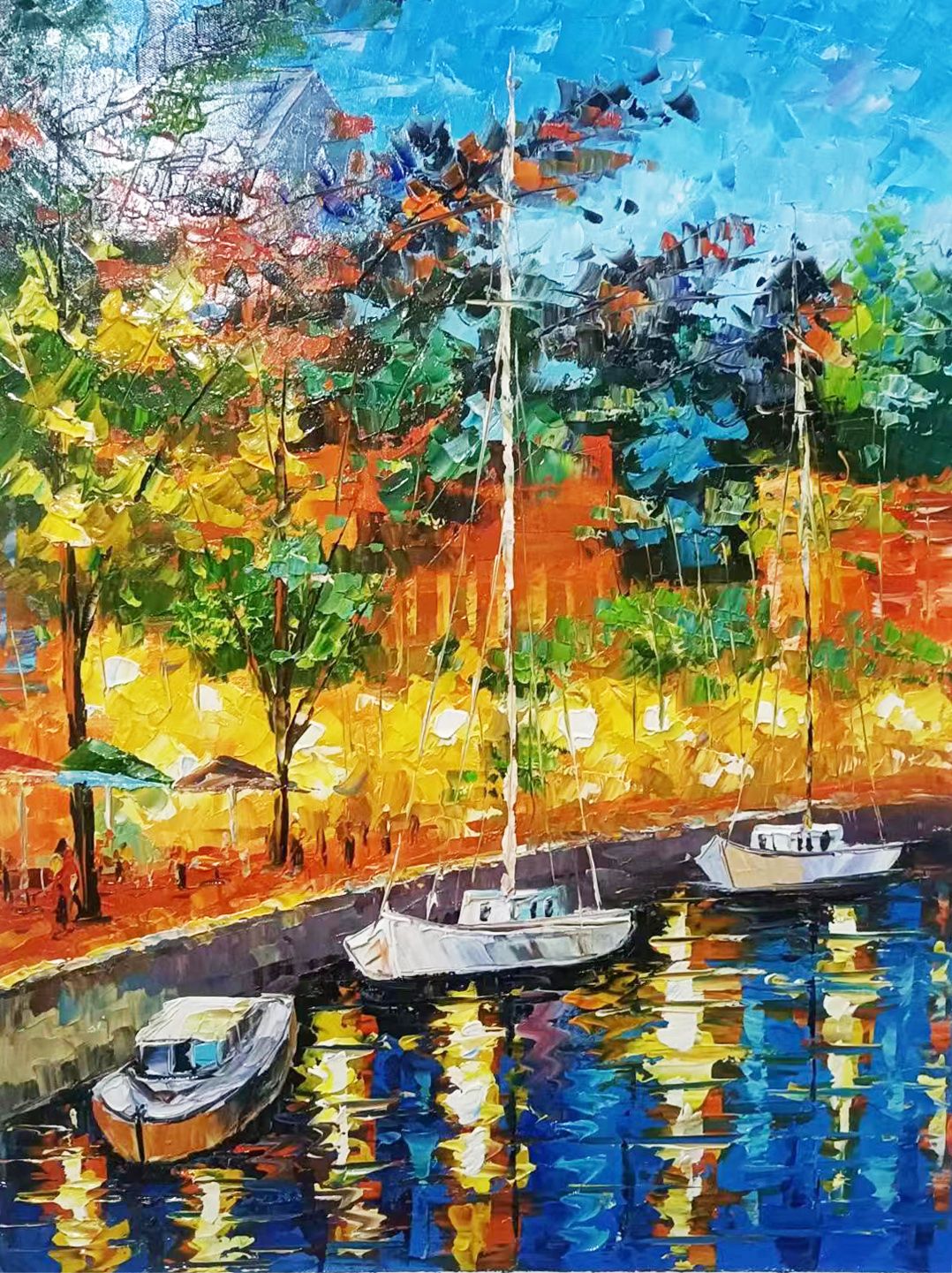 经过多年的创作韩鸿老师形成了独特的风格。其老师的作品,浓色重彩表现都市人物和风景题材对光影的表现体现在大色块。色彩使用调色刀代替画笔来描绘风景、城市和人物,创造一种独特的艺术绘画风格。用色大胆、纯色体现明暗及光感明亮,传达他的乐观激情。其作品主要用调色刀与天然油料的搭配在画布上作画。自成一派。他的绘画技巧、色彩上的层次运用纯熟浑厚,具有极强的生命力和收藏价值。韩鸿老师的作品多次参加法国巴黎大皇宫举办的“独立艺术家”艺术博览会,巴塞尔等国际艺术展,获奖多次。他在美国,英国,法国,意大利,俄罗斯等多个国家举办个人展览。是当代国际市场具有潜力的油画名家之一,多幅作品被洛克菲勒家族,杜邦家族,罗斯柴尔德公子收藏,以及房地产大咖潘石屹,中国香港著名影星等知名企业家和私人收藏。