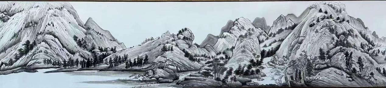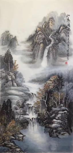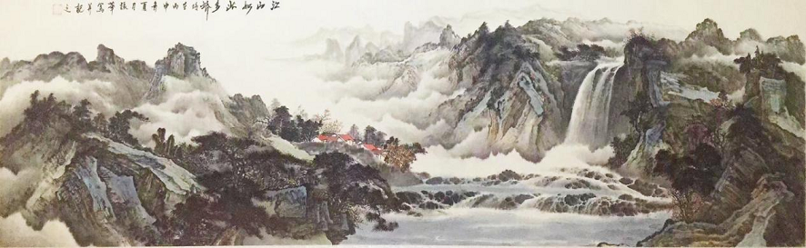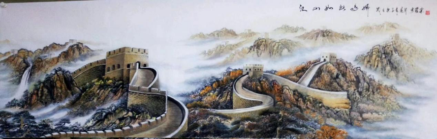 山水作品《江山如此多娇》《长城雄风》以笔取气以墨取韵,清逸高雅、大气磅礴、远山近峰浑然一体的景色给人一种清幽雄厚之美感。雄伟壮观幽谷奇峰千山万壑重岩叠嶂,白云缭绕,使人神往,让人大有“登山则情满与山,观海则情满与海”之感。