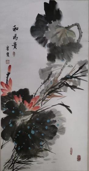 花鸟作品:活灵活现、得其神髓、运笔生动、刚柔相济、刻画入微、林漓尽致。牡丹花瓣肥嫩如酥,娇艳欲滴。荷花墨韵传神靓丽唯美,清雅而不俗,虚实相生。无画处皆成妙境。技法闲熟,独特的创意构图手法给人新颖有趣的感觉。