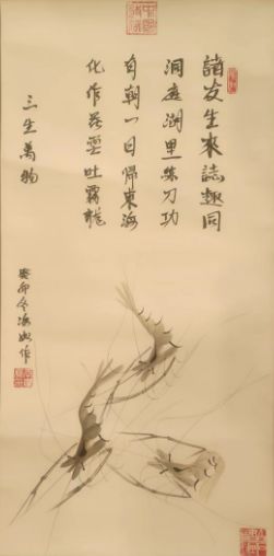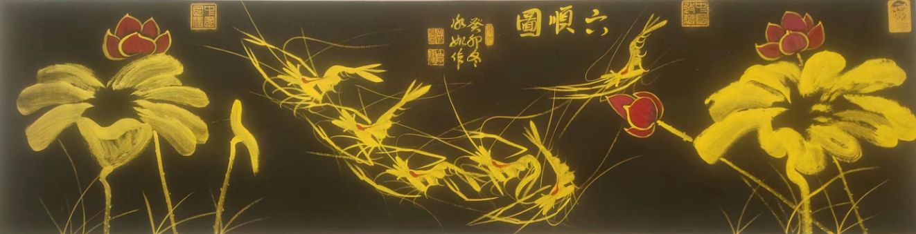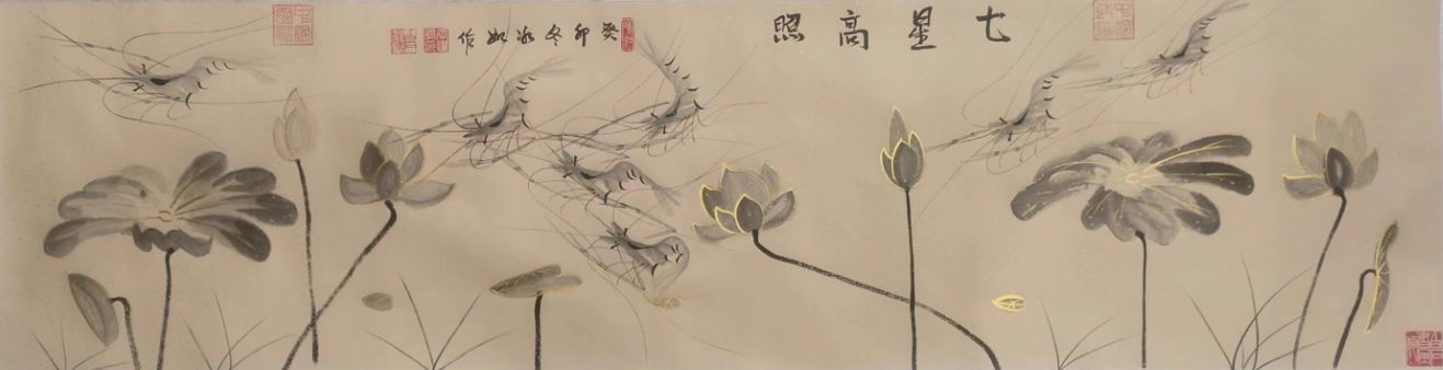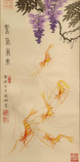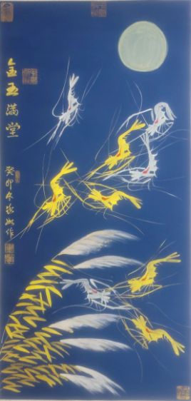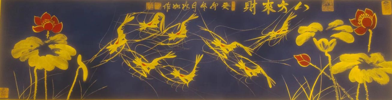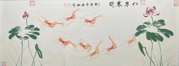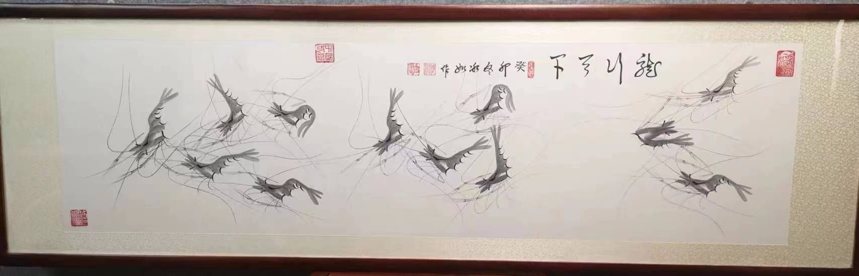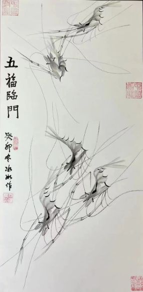 《五福临门》,2010年被著名演员王刚登门拜访20万收藏,因独创原创了抬头虾,翻背虾,被评为水墨虾神,2012年参加“金顶奖”全国书法美术大展赛荣获金奖,2015年受邀上海美术馆入展作品