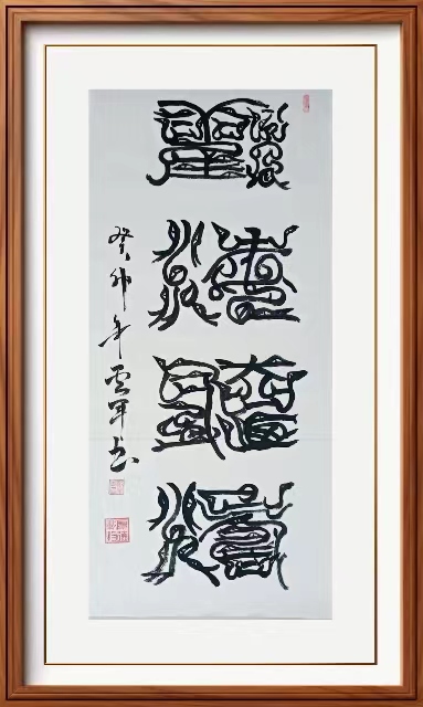 戴荣军先生不是一个张扬的书写者,尽管他的字里有性情的张力,他是一个取法的标拨者,创作的坚守者,生活的执行者,更多的时候,他的支点只和写相关,这些与书写相关的因素,展现在他的字里,就是朴实,沉静,宽博,高古。初观戴荣军先生作品给人印象最深的便是严谨而不失灵动排列布局和韵出天然的内质,仔细欣赏会有一种循序渐进,慢慢深入的品鉴,若惊涛拍岸,如群岭逶迤,时而流走盘施,时而彩带当空,大小高低在错杂构成中变化无穷,且意蕴深长,磊磊落落,洋洋洒洒,将自身的艺术风格展现很淋漓尽致,让人无不赞叹。