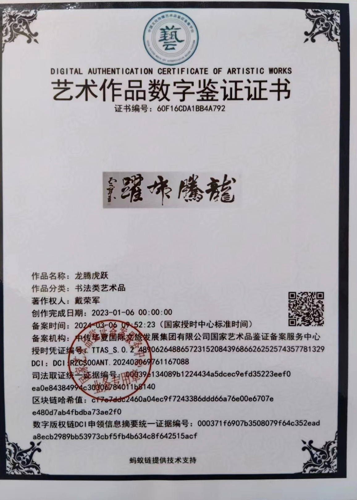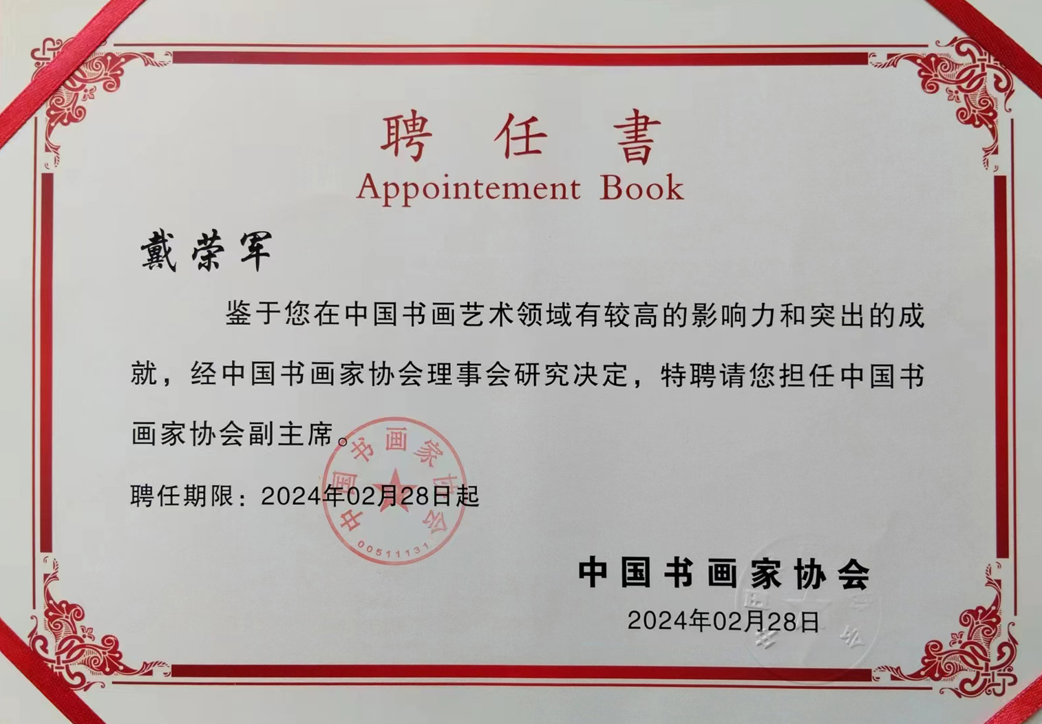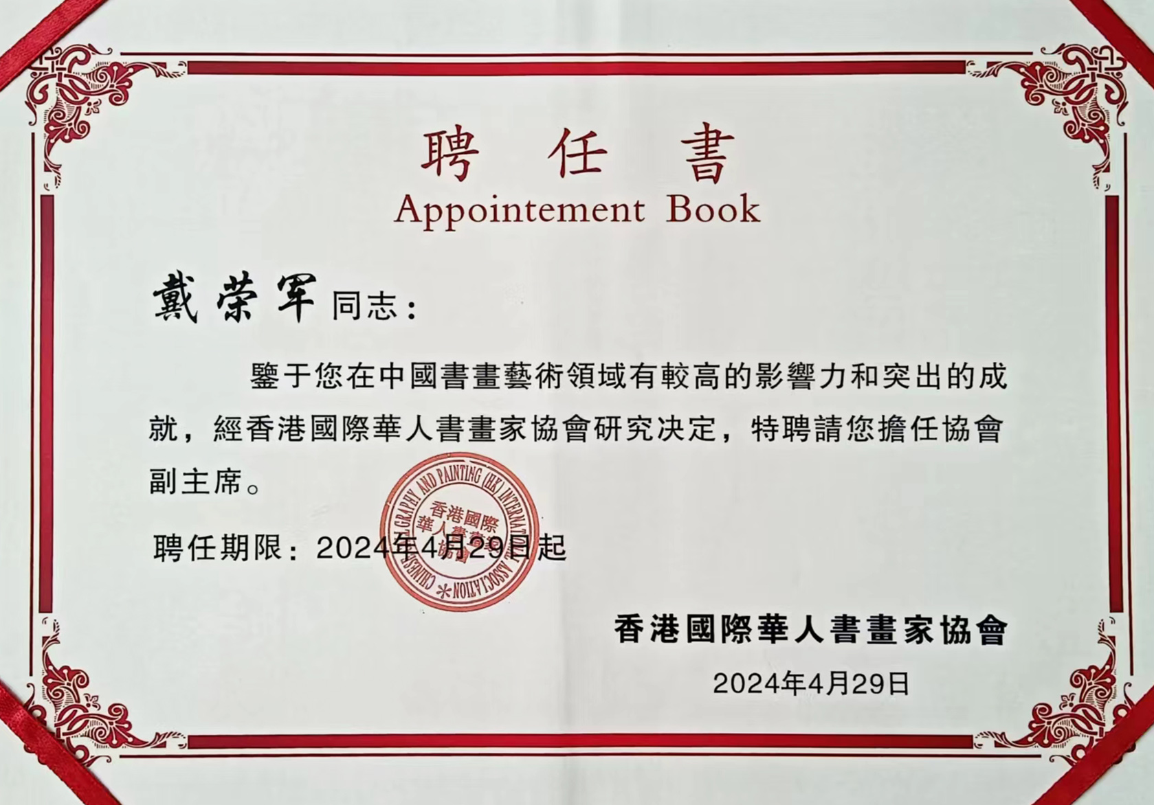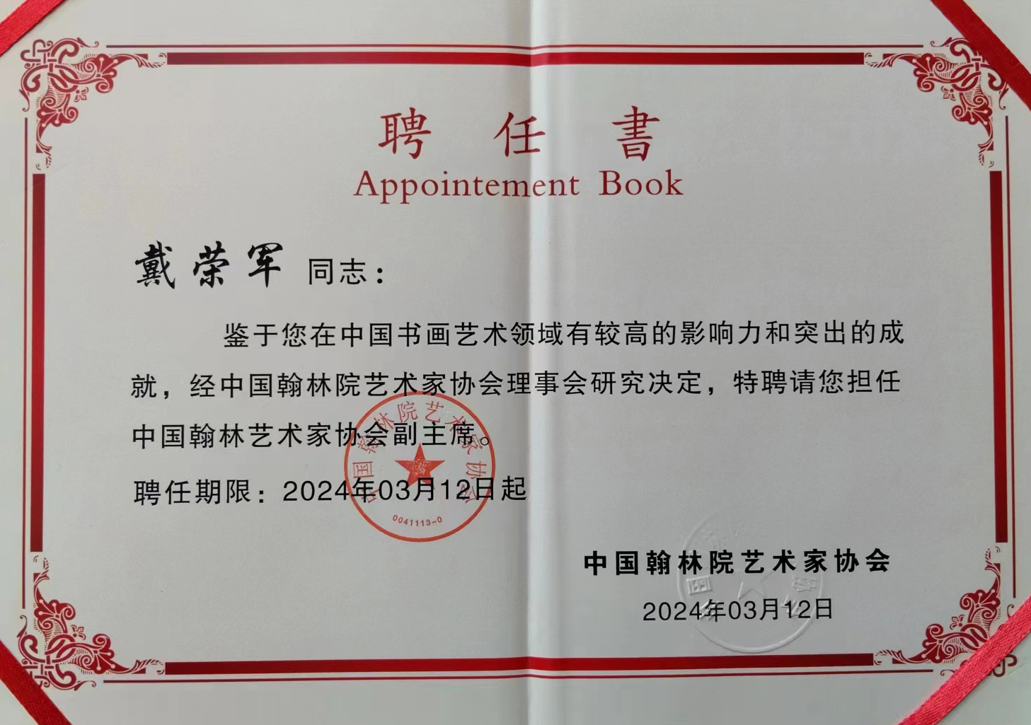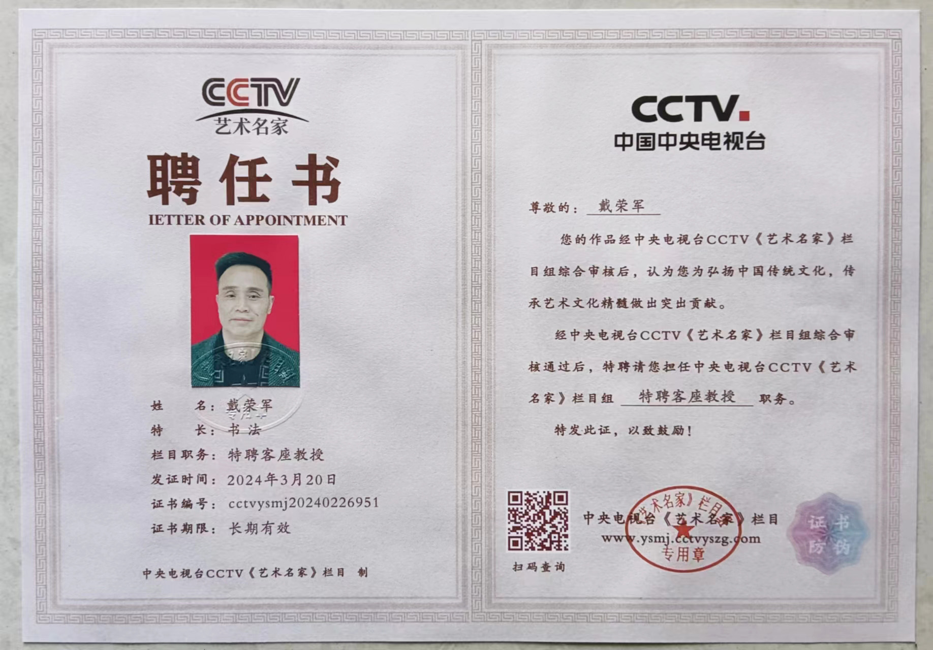 为进一步弘扬传统文化艺术,推进新时代文化艺术高质量发展,为此,中国中央电视台郑重向戴荣军先生发启了邀请,特聘请戴荣军先生,担任CCTV《艺术名家》栏目组终身特聘教授,并颁发了聘书,以兹更好的发挥艺术影响力,承担起传承中华优秀传统文化的责任,秉持专业精神,奉献才智,建言献策,积极在全社会推动和弘扬中华优秀传统文化特别是激发年轻一代传承发扬文化的积极性和创造性,作出贡献。