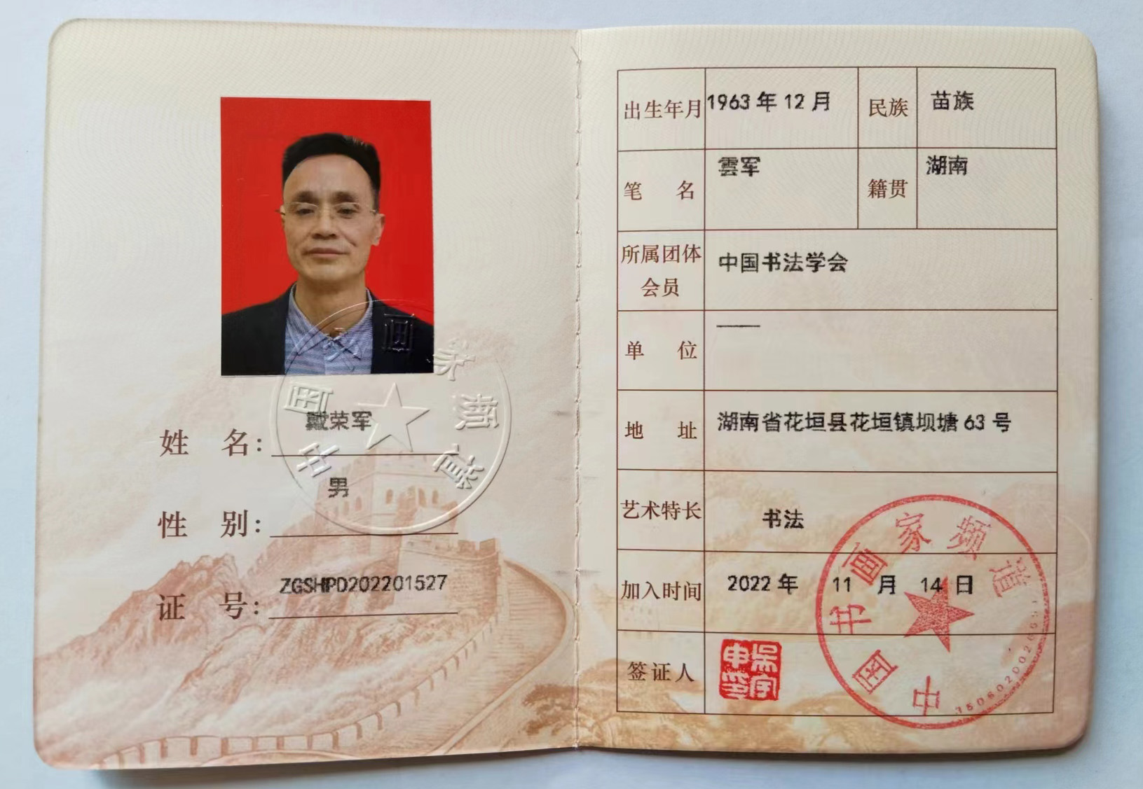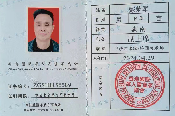 戴荣军,中国翰林艺术家协会副主席,教授。 籍贯:湖南,现居住北京,笔名:雲軍水墨,西南政法大学毕业。中国国礼书画家协会副主席,中国翰林艺术家协会副主席,现代著名书画家,诗人,中央电视台CCTV《艺术名家》栏目组特聘客座教授,中国翰林书画院副院长,香港国际华人书画家副主席,中国翰林院文化艺术中心教授,北京翰林院艺术教授中国诗词学会会员,北京翰林书画艺术家教授,翰林文化艺术中心书画艺术培训基地教授,湖南寧致书画艺术馆副教授,北京汉墨书画院副院长湘西宁致书画院院长,北京翰林书院院士。中国高级书画艺术师,/绘画美术师,中国一级书画家。中国书法家协会会员中国书画家协会会员,中国书画家协会理事。