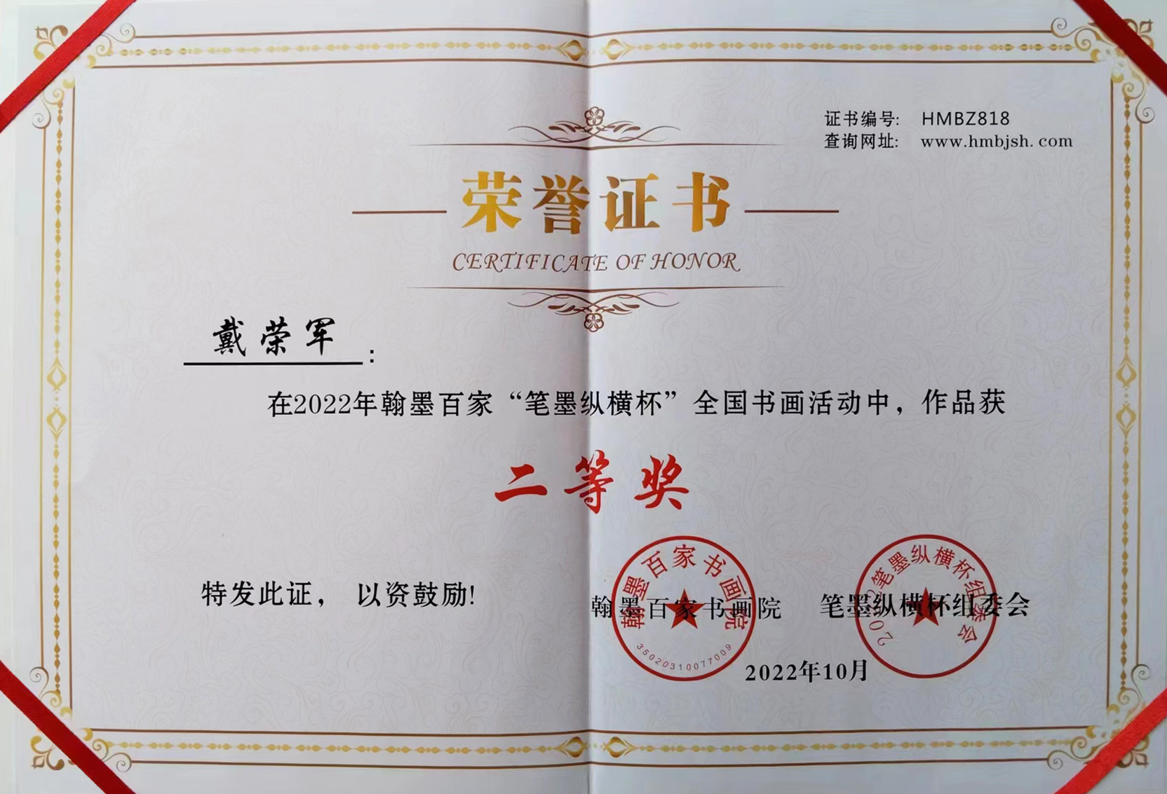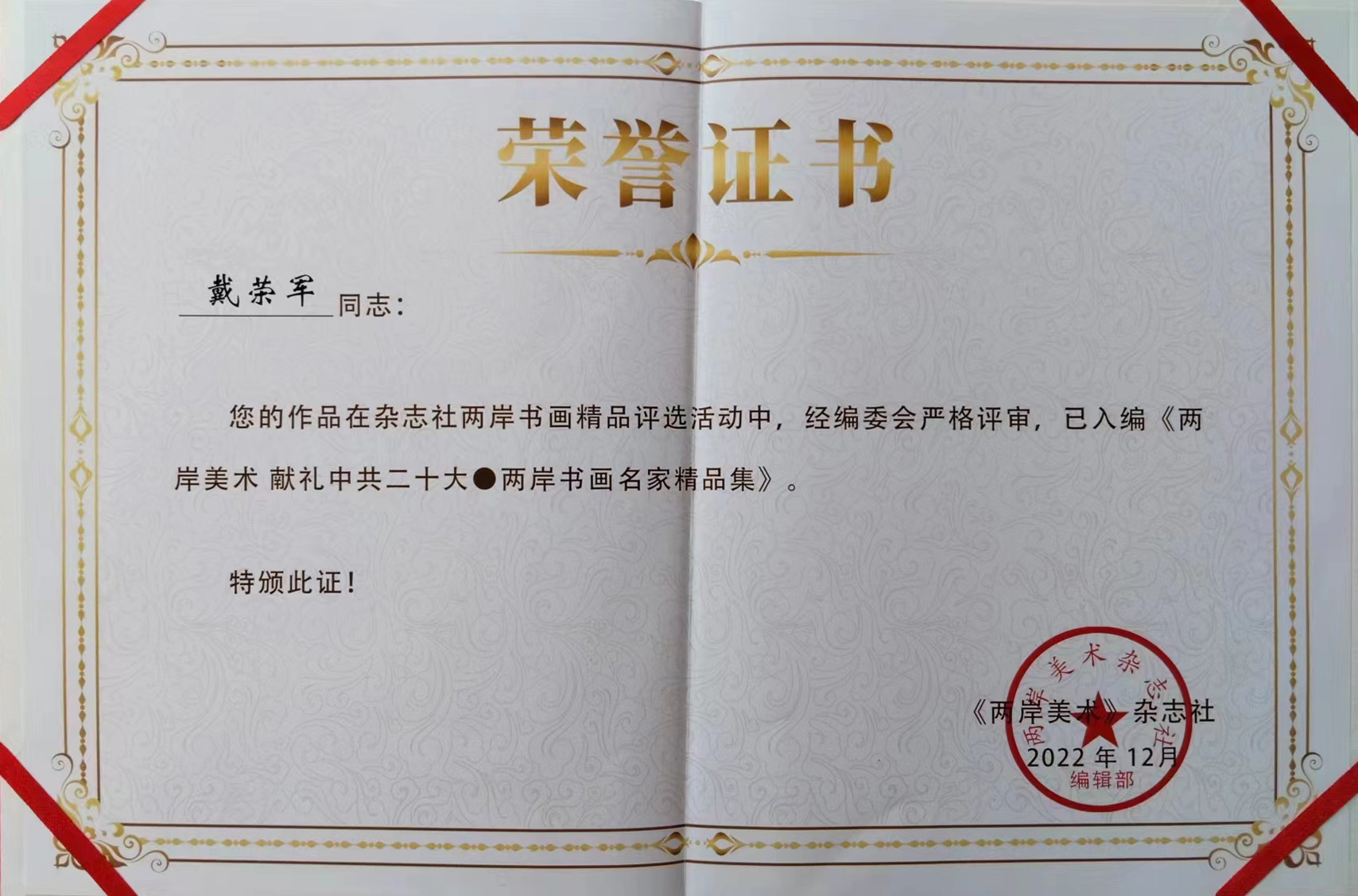 二0二四,入驻《最美中国新时代楷模人物资源库》,二0二二年间诗集,书画录选入《献礼中共二十大●两岸书画名家精品集》入编发表,荣誉证书。自幼爱好诗词,便对书法有着浓厚的兴趣,几十年如一日,努力勤奋,不断进取,笔耕不辍。在吸取前人的精华上也不断的向现代书法大师、名家、同仁求教学习,最终研究出形成自己的独特艺术风格。其作品稳重大气,苍劲有力,灵动飘逸,并能领悟到一种心灵净化的美感。得到专家组的肯定,笔法精湛,字体结构美,呈现出独特的艺术风格和审美情趣,其书法作品不仅具有高度的芝术价值,也为我们提供了丰富的文化思考和欣赏价值。
