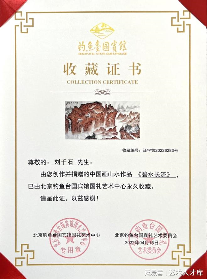 2022年中国画作品《碧水长流》被北京钓鱼国台宾馆国礼艺术中心永久收藏,并颁发收藏证书