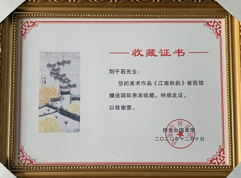 2020年作品《江南秋韵》被钓鱼国台宾馆赠送国际贵宾收藏,并颁发收藏证书;