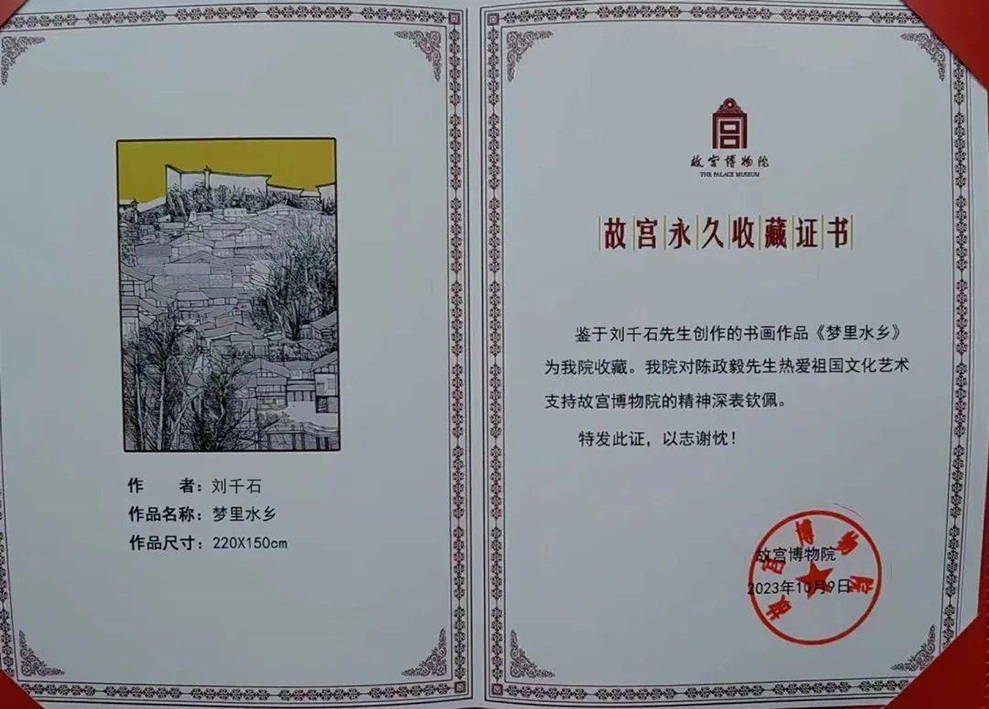 2023年国画作品《梦里水乡》被故宫博物院收藏,并颁发收藏证书;