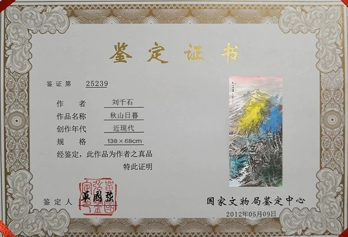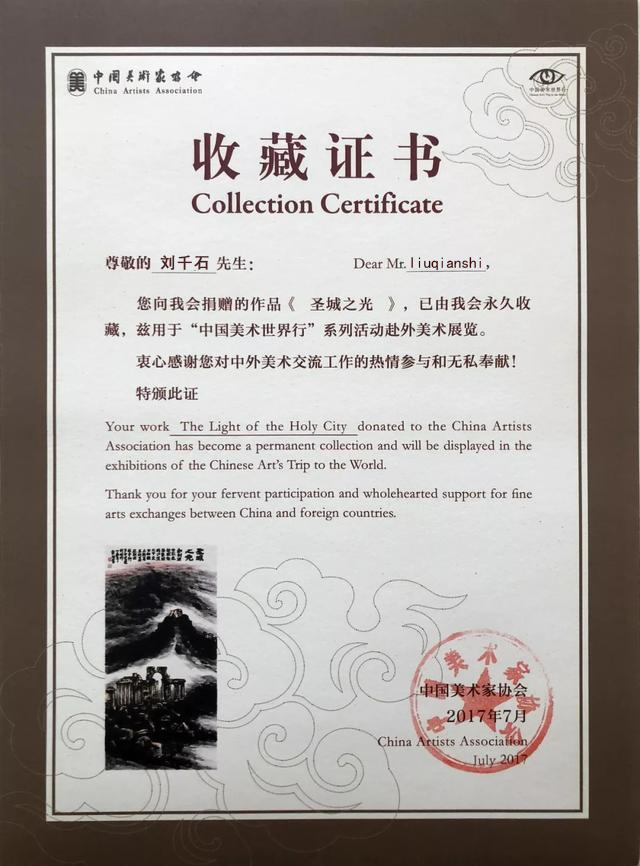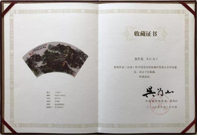 2018年中国画山水作品经中国美术馆收藏评鉴委员会收藏,并颁发收藏证书;