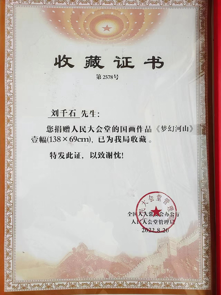2022年为人民大会堂创作巨幅中国画,《梦幻河山》被人民大会堂收藏,并颁发收藏证书;