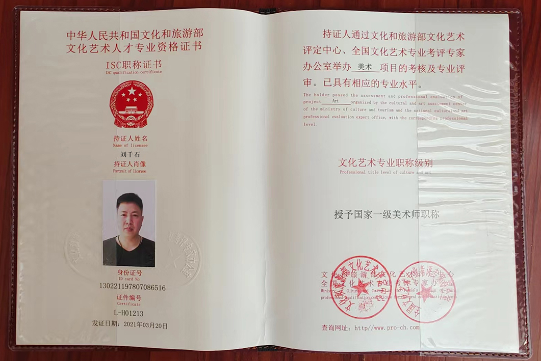 2021年中华人民共和国文化和旅游部文化授予国家一级美术师职称证书,文化艺术人才专业资格证书。