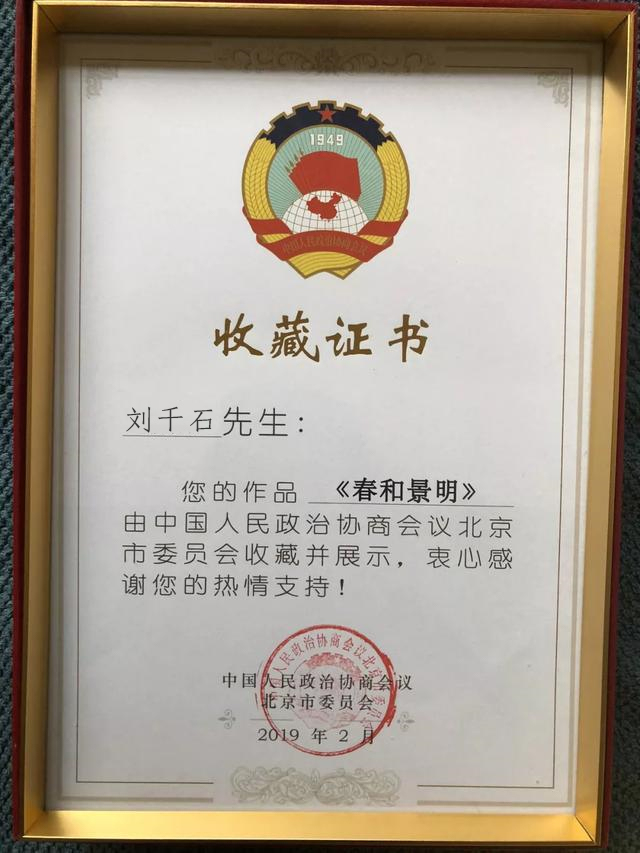 2019年国画作品《春和景明》由中国人民政治协商会议北京市委会收藏并展示,颁发收藏证书;