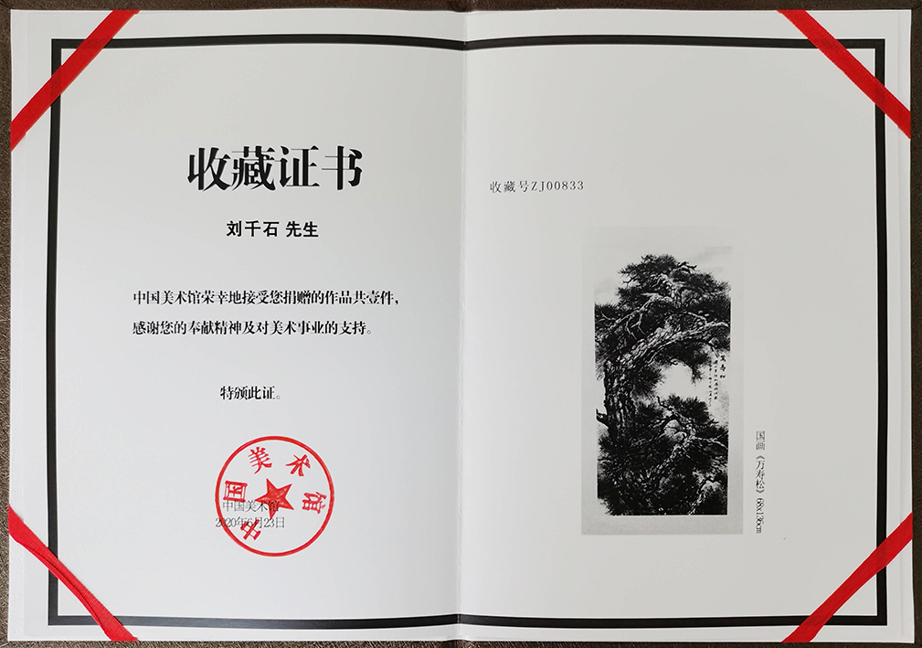2020年国画作品《万寿松》,被中国美术馆收藏并颁发收藏证书;