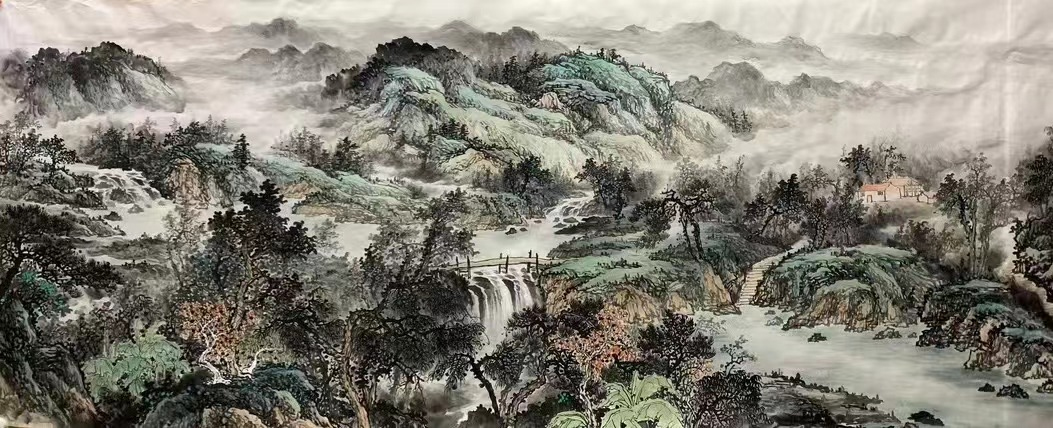 2024年3月周舒燕国画作品,一幅宽10米高2.8米山水画被人民大会堂收藏。