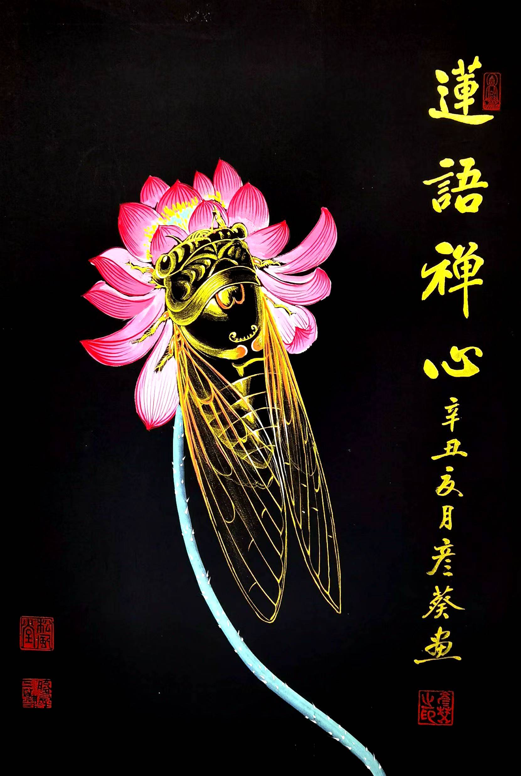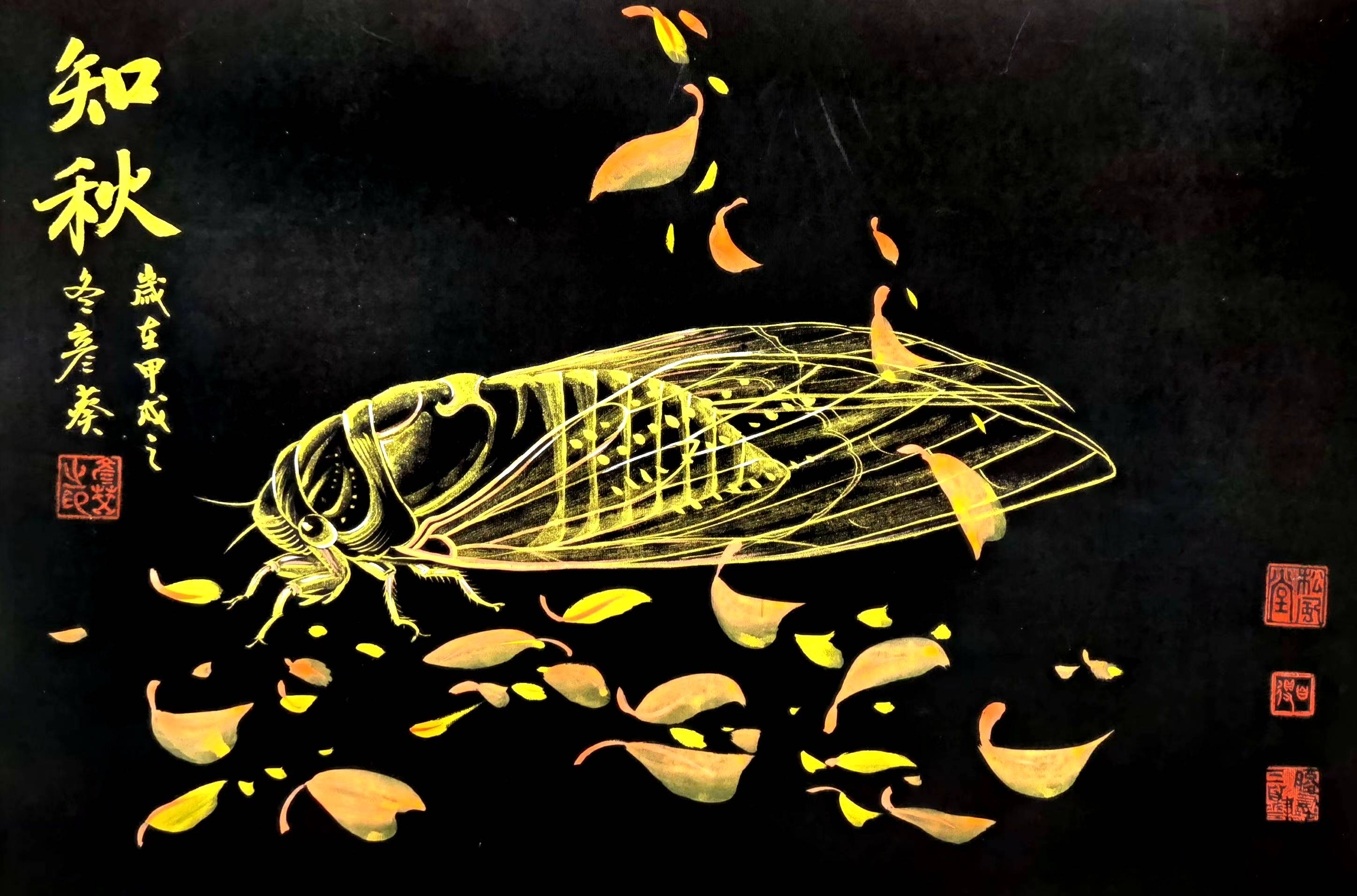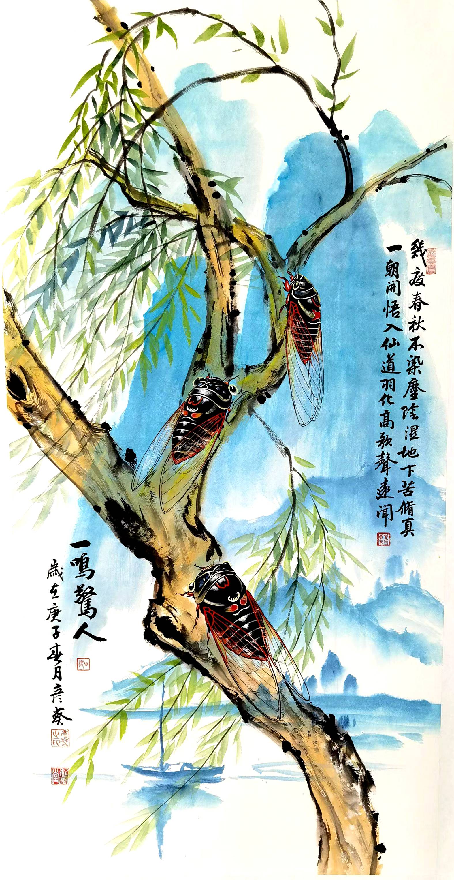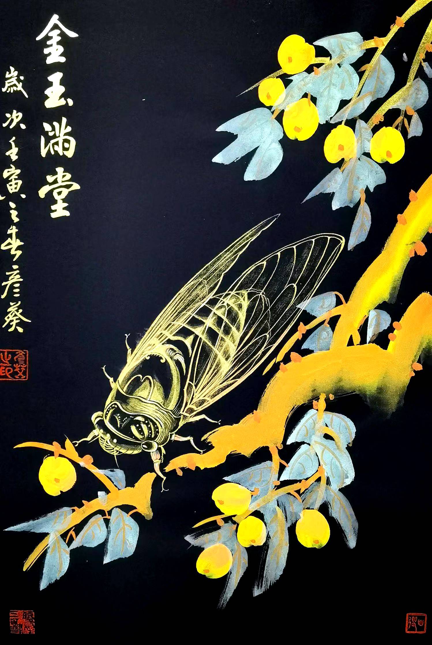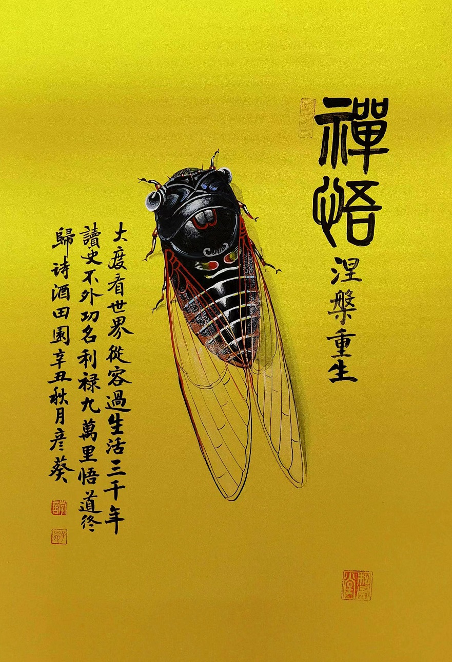蝉:一鸣惊人之寓意,重生之寓意,既有金蝉脱壳之美意,又有佛家之禅意,陈大鹏画家对于蝉的理解,可以说是很透彻,他以自己平生所学,又有夸张的手法,加入西方艺术的审美观,完美结合,行成自己独特风格,因而被世人称为“中国画蝉第一人”。