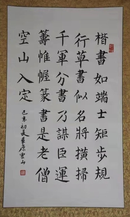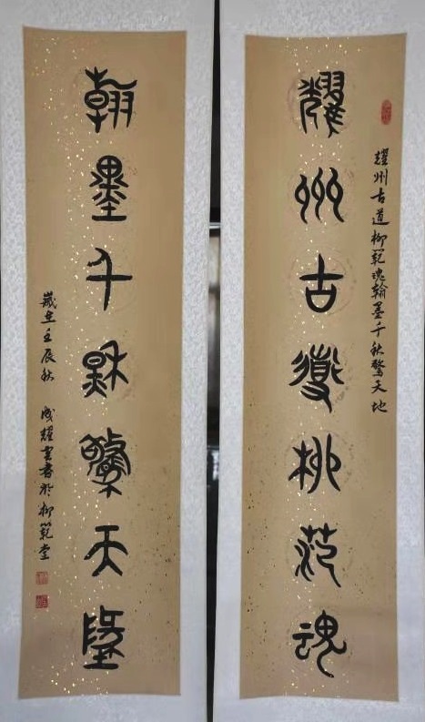 “新意自出,别成一家”的范宽,乃耀州宋代杰出画家。他善画山水,重视写生,常居山林之间,危从终日,从不停止。其构图继承荆浩“善写云中山顶,四面峻厚”传统,用笔雄劲而浑厚,笔力鼎健,善用黑沉沉浓厚的墨韵,显得作品厚实而滋润,气派雄伟,境界浩莽。其皴法一般称之为“雨点皴”“芝麻皴”,下笔均直,形如稻谷。屋宇画作善先用界画铁线,后以墨色笼染,被后人称作铁层。但晚年用墨过多,土石不分,势虽雄杰,然深暗如暮液晦暝。而“书贵瘦硬方通神”的柳公权楷书,取颜,欧之长,自成一体,成为唐朝最后一位著名书法家。其字取匀衡瘦硬,追魏碑斩钉截铁势,点画爽利挺秀,骨力遒劲,结构严谨,较之颜体则稍均匀瘦硬,故有“颜筋柳骨”之称。柳公权碑帖,是大师传世之宝。但由于字体间架结构不同一般,常人不易临帖研习,少于传承。而成耀雲先生却把临摹、研习柳公权书法作为耀州人继承弘扬典范之必修,遵循柳公“用笔在心,心正则笔正”的古训,日练不休,渐求微进,终于修得正果。其书写的柳体书法作品深得大家喜爱,并为不少友人所收藏。