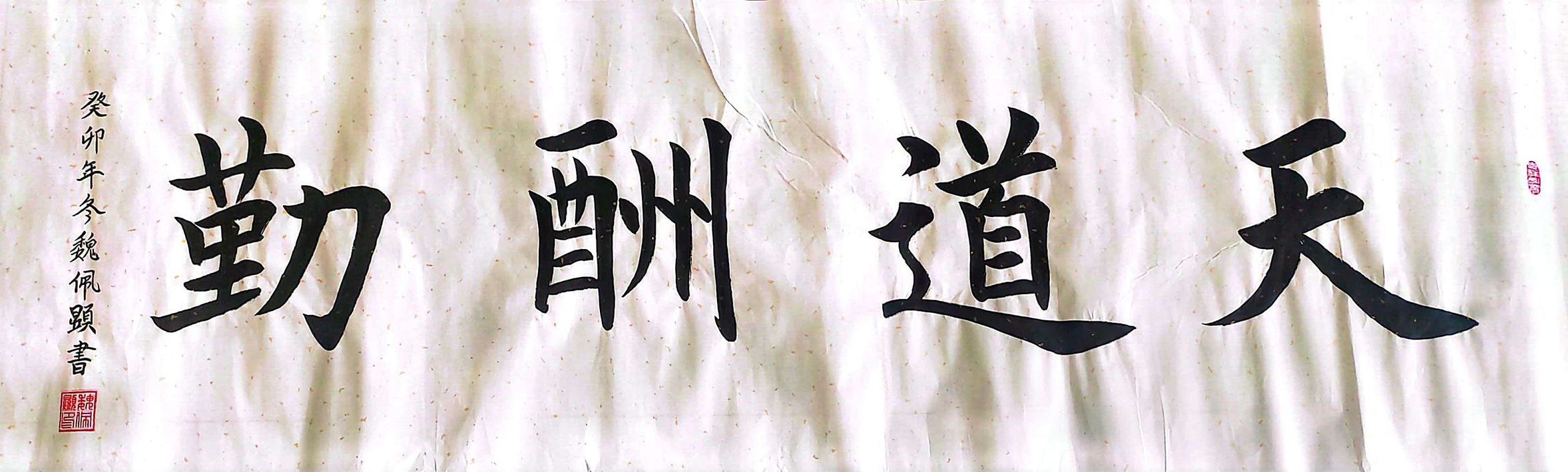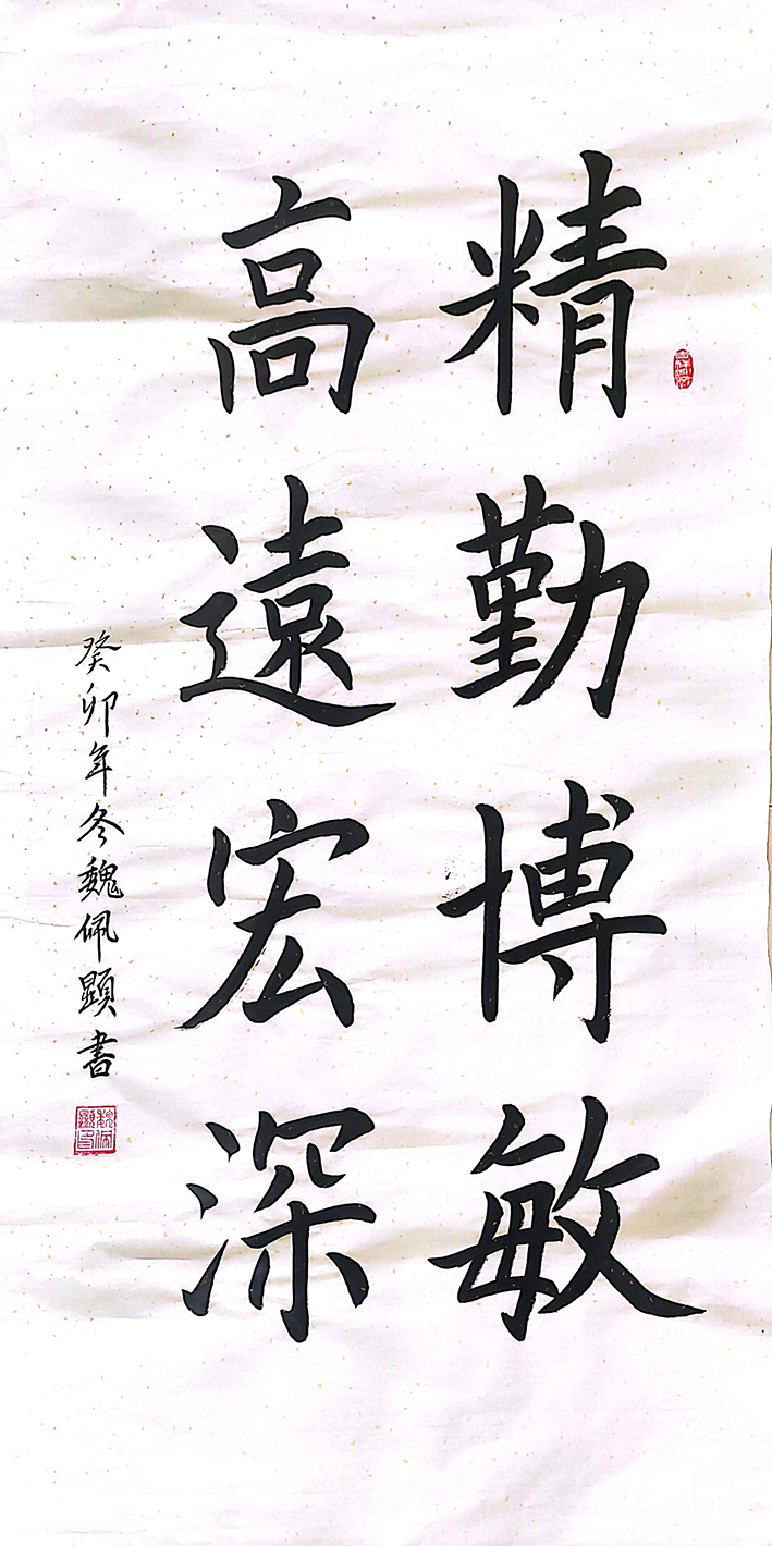 魏佩显先生的隶书则始从汉隶,古源魏碑,朴实纯厚、灵犀独慧。篆书取金文、汉唐篆法,精炼而笔力凝重,有如邓石如的铁线小篆,金石味十足。可见对远古的大篆、秦小篆都有深刻的研究。遒劲硬骨的楷书,灵秀洒脱的行草,古朴醇厚的隶书……观他的书法作品,不得不感叹:人奇字自古。几年来,他把练习书法作为一项乐趣。每天坚持练习,以楷书为主,兼学行书、隶书、草书、篆书等其它字体,已成为生活中一件愉悦又不可缺少的生活内容。