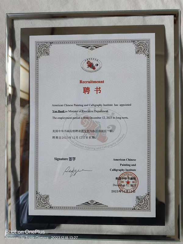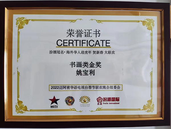 2022年1月荣获《美国2022迈阿密华语电视台春节晚会组委会》颁发的 书画类金奖;