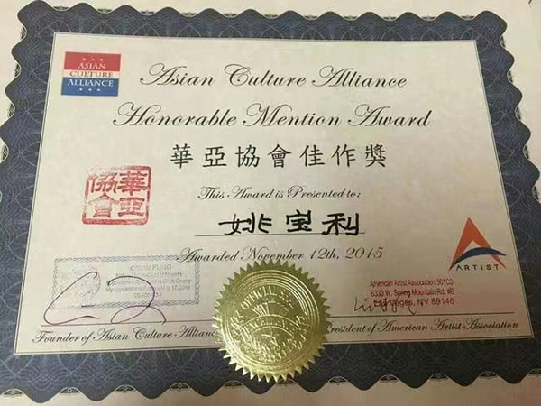 2015年10月份荣获在美国举办的亚洲第一届艺术节书画展其作品获得佳作奖(最高奖);