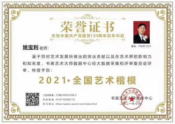 2019年8月庆祝建国70周年“华诞杯”书画展荣获《二等奖,2021年庆祝建国100周年,被书画艺术大师数据库评为《全国艺术楷模》称号;