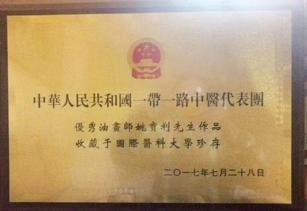 2017年7月28日中华人民共和国一带一路中医代表团用我的作品作为国礼赠送给国际医科大学 ,由此国际中医大学特颁发收藏牌匾证书;