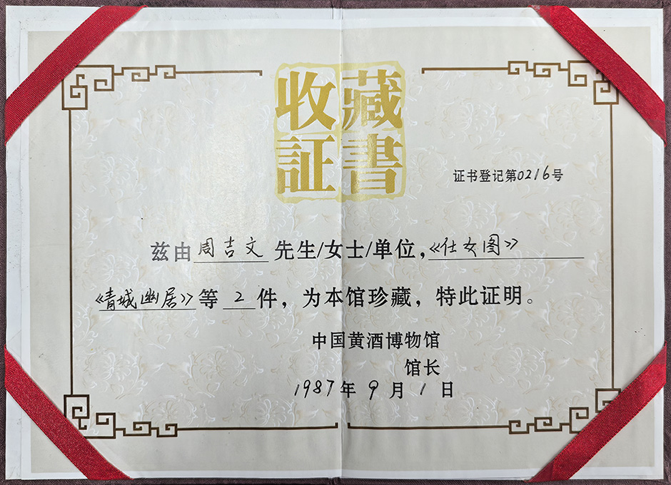 1987年,作品《仕女图》、《青城幽居》由中国黄酒博物馆收藏。