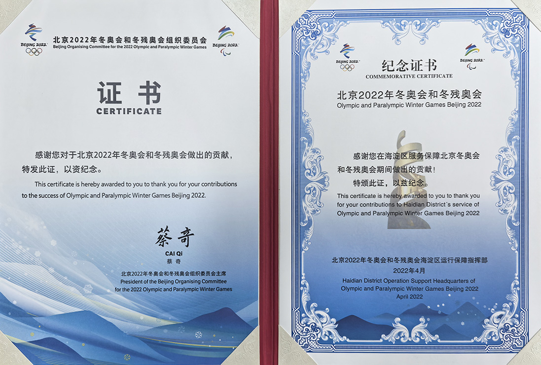 2022年,由北京2022年冬奥会和冬残奥会组委会颁发“北京2022年冬奥会和冬残奥会贡献表彰证书”。